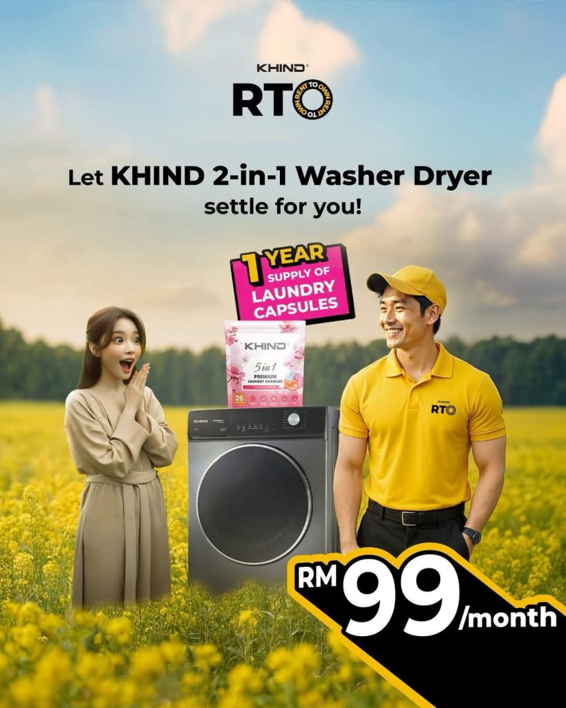 Daftar pelan RTO Washer Dryer 2-dalam-1 KHIND, dapatkan sabun 5-in-1 Laundry Capsules PERCUMA selama 1 tahun! Bersihkan pakaian tanpa beban, hanya RM4 sehari!